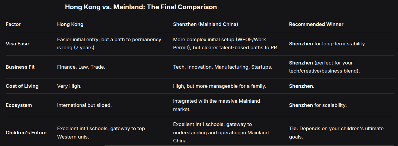 • Why Shenzhen over Hong Kong? Lower cost of living (especially for a family of 5), direct proximity to the world's manufacturing and tech hub, a more "forward-looking" immigrant-friendly vibe, and it's the heart of China's innovation. Hong Kong is excellent for finance but your business blend is perfect for Shenzhen.